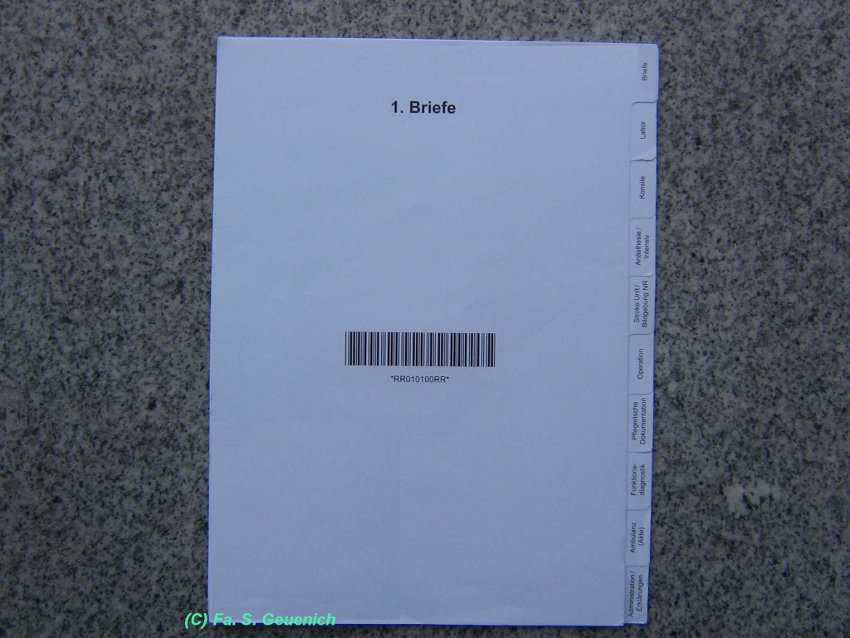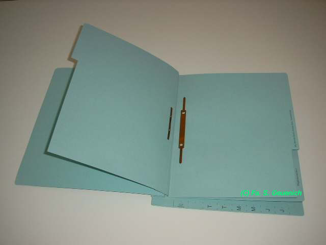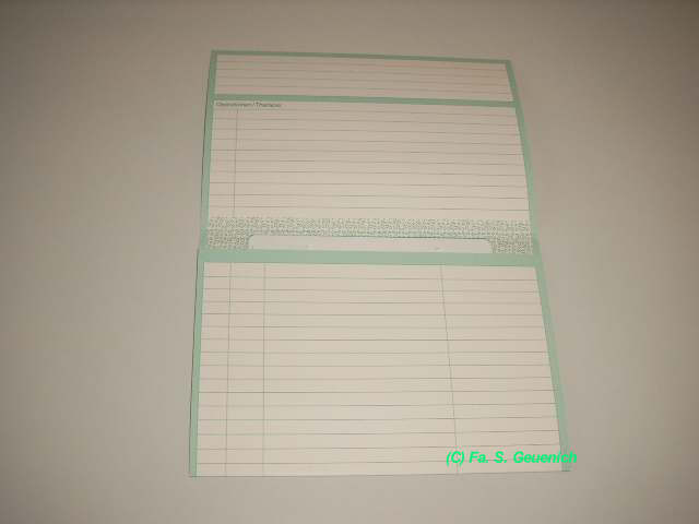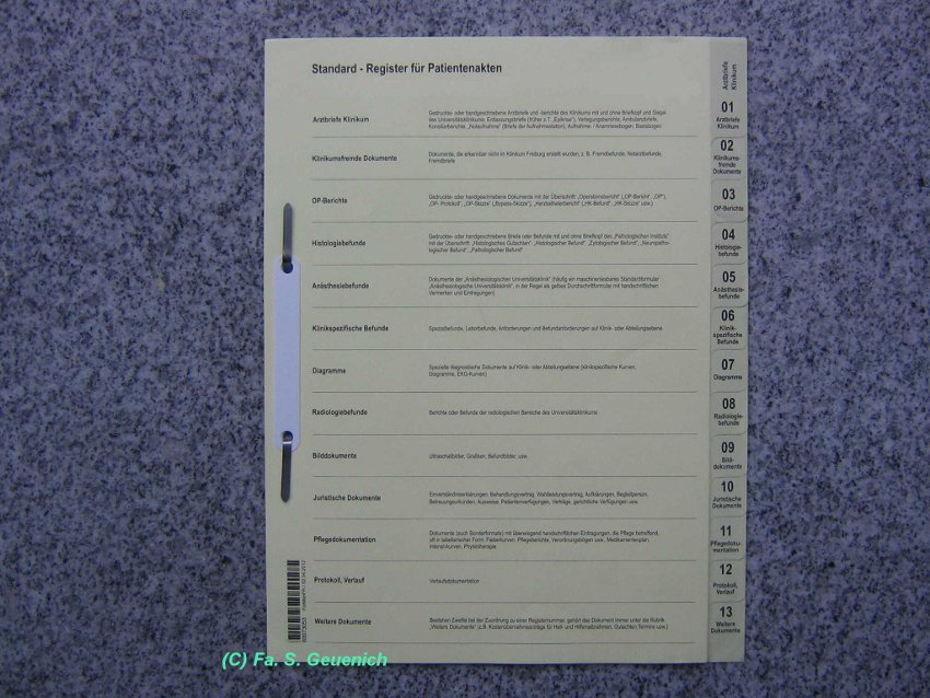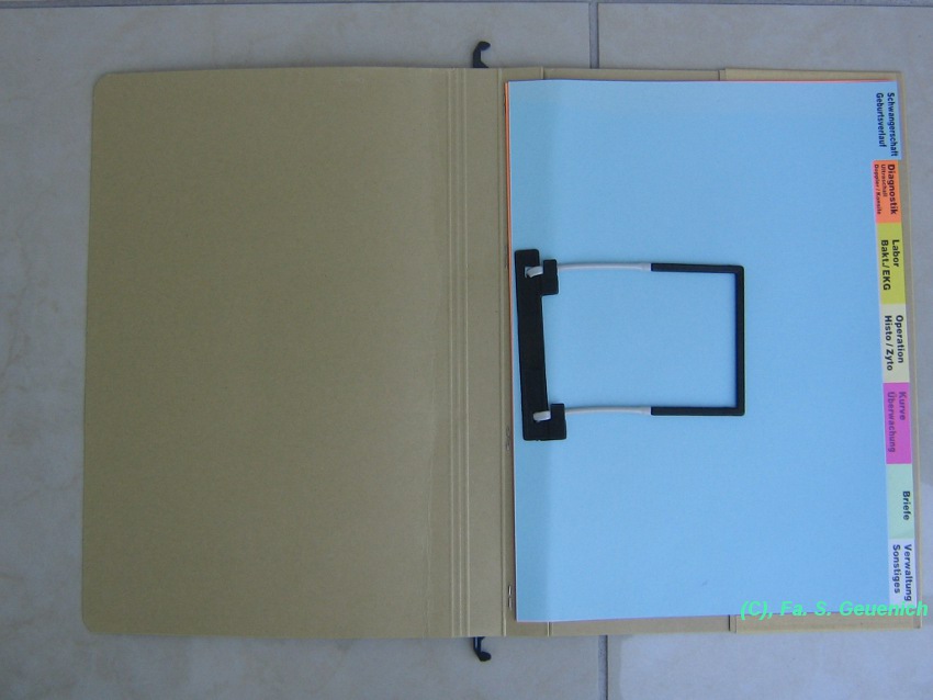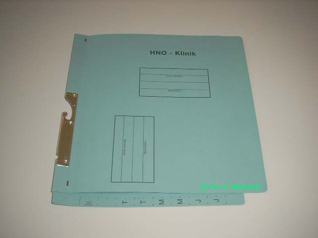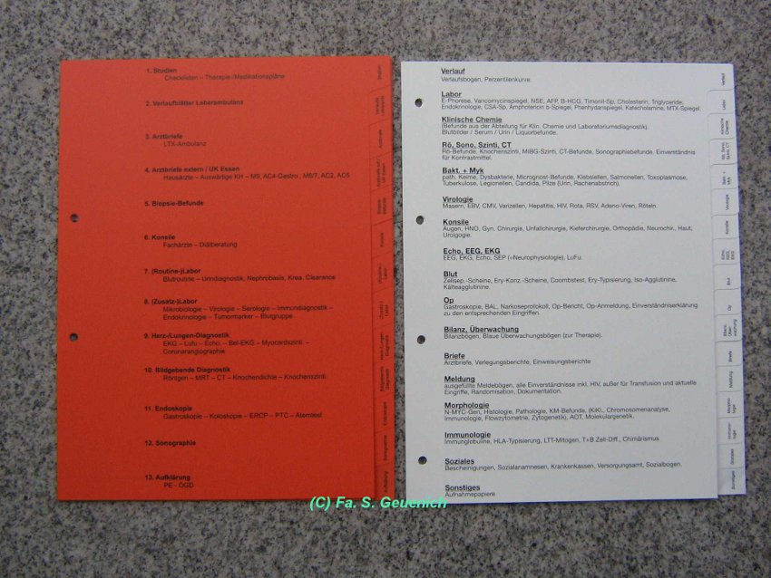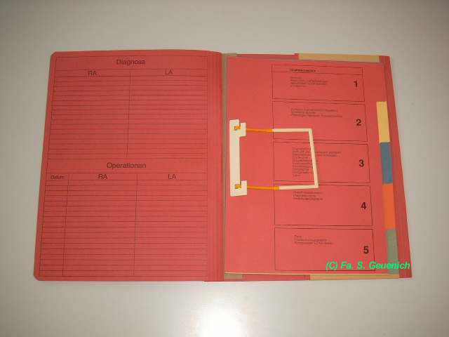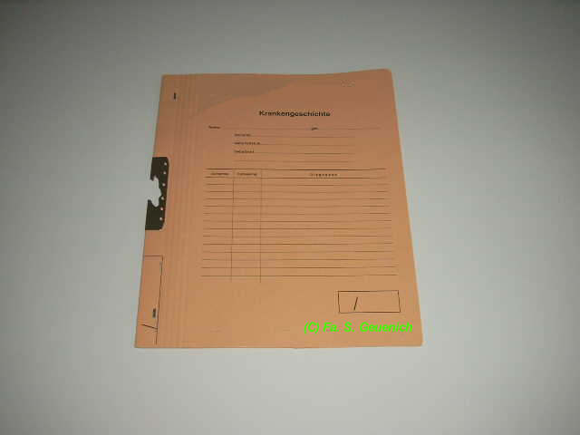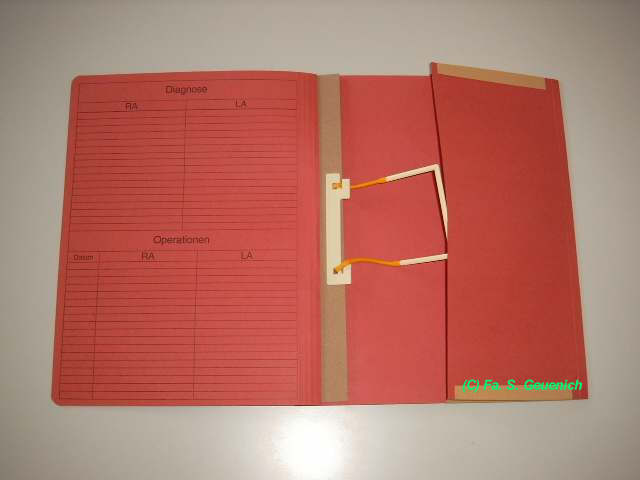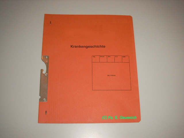 ohne oder mit Beschlägen aller gängigen Systeme: Pendel, T-Gleit, Lotrecht für Krankenakten oder Krankengeschichten, Stationsakten usw. Zum Beispiel mit eingearbeiteten Trennblättern, Registern, Abheftvorrichtungen, Taschen, mit und ohne Druck.